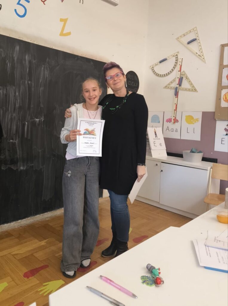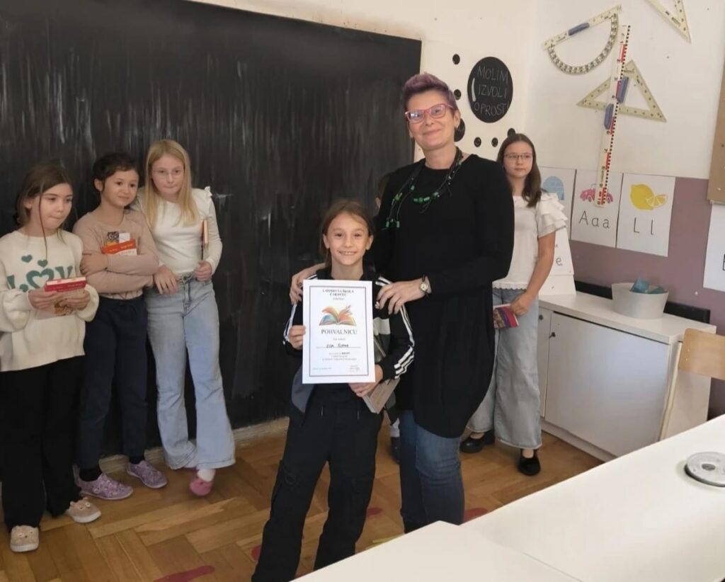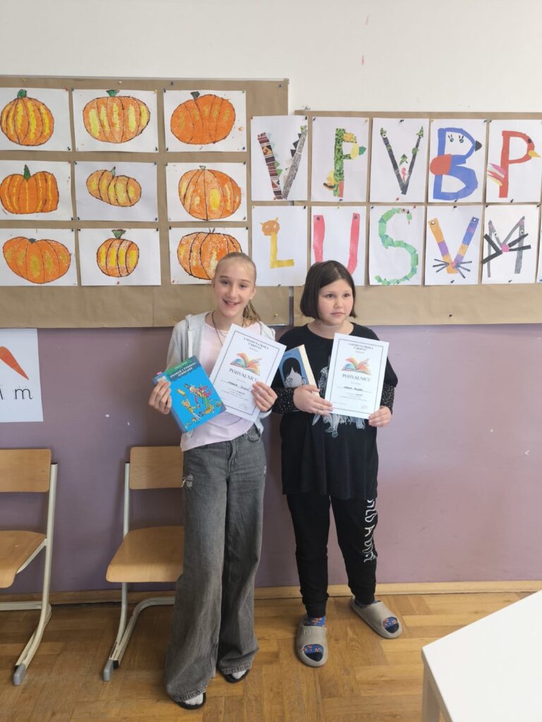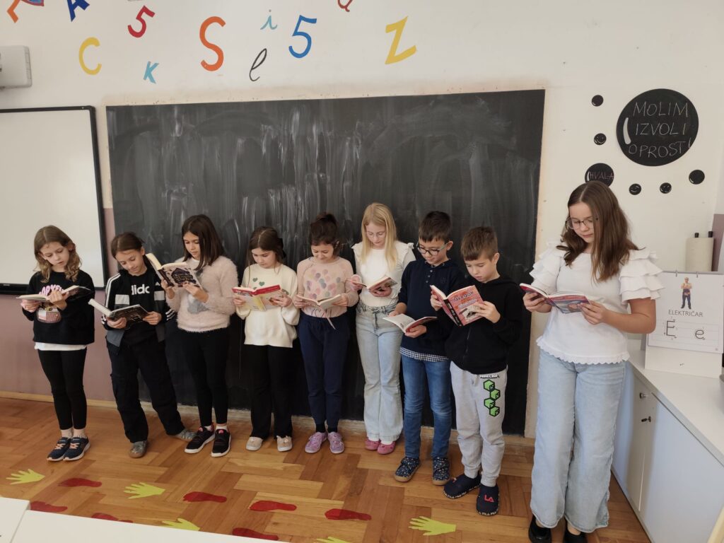 U utorak, 4.11.2025., u našoj se školi održalo školsko Natjecanje u čitanju naglas. Skupilo se čak jedanaest mladih izvrsnih čitača, ljubitelja knjiga i neobičnih svjetova. U mlađoj kategoriji sudjelovali su Ema Knez, Hana Debelec, Erin Turk, Luka Kostel i Patricija Vincetić, učenici trećih razreda, te Jakov Blažinčić, Zoa Šopar, Ira Horvat i Iva Vukoja, učenici četvrtih razreda. U starijoj kategoriji sudjelovale su Ivanka Poljak i Franka Šimunić, učenice šestih razreda.