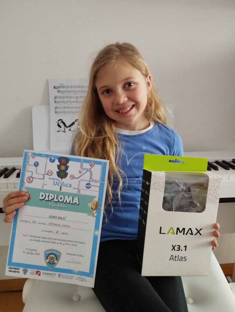 Dora Balić, učenica 3. a razreda, osvojila je drugo mjesto na 17. državnom natjecanju u poznavanju prometnih propisa „Prometna učilica“. U učionici je vladalo veliko uzbuđenje i veselje kada su Dori predstavnici Policijske uprave međimurske i predstavnik tima „Prometne učilice“ Milan Stevanović uručili diplomu i nagradu. Dora od prvog razreda sudjeluje u natjecanju i ove godine svojim je znanjem i trudom osvojila vrijednu nagradu, sportsku kameru Lamax.
